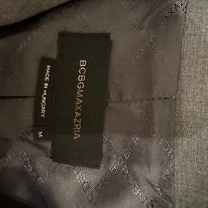 BCBG MAXAZRIA Grey Blazer Suit Jacket Dressy Size M The blazer has one button closure, accent buttons on the cuffs, two flap pockets, peak lapel, double vented. The length is 22 inches measure from the shoulder. This brand runs a bit small. Great condition.