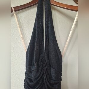 BCBG MAXAZRIA halter dress. Black with metallic rainbow sparkling. Back zip closure V-neckline. Ruching around bodice. Lined. Slinky. Size S Pit to pit flat lay 14.5" length from top center of halter to hem 56" measurements are approximate