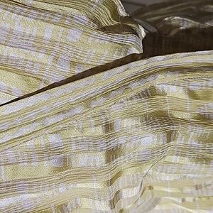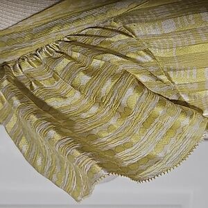There is no fabric tag, but the fabric is so lovely, and I believe that it is silk. the color is greenish yellow. Excellent condition and quality.