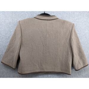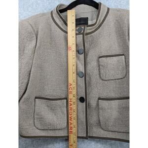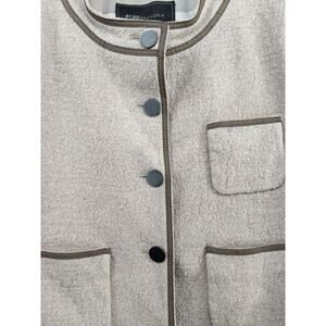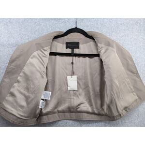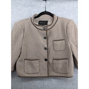 This listing is for a BCBGMAXAZRIA Wool Blend “Dickenson” cropped lady jacket blazer in size Small. Features a structured fit, cropped length, 3/4 sleeves, three front pockets, and a modern, minimalist design. New with tags, but note: some trim peeling in a few areas (see photos).
