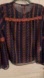 Amazing sheer women’s size XXS long sleeve top with extended bell sleeves, lace accents, vertical bohemian floral embroidery all over navy base with burnt orange rust color embroidery. BCBG MAXAZRIA women’s XXS Bell sleeve, sheer long sleeve top navy & rust color.