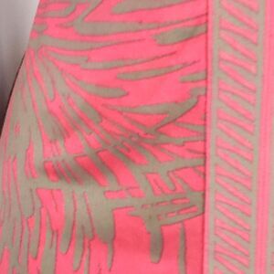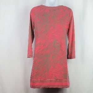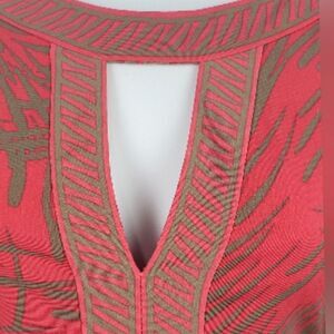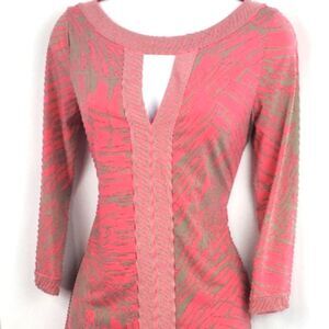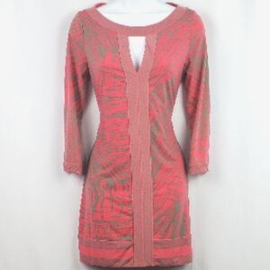 Stylish pink and tan knit pullover dress with 3/4 inch sleeves. Has keyhole design in front. Size tag is missing, appears to be a small according to size chart for BCBG. Approximate lay flat measurements are as follows:
