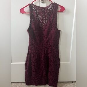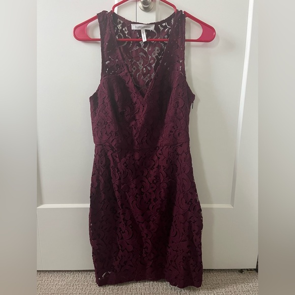 BCBG Maroon Lace Dress. Form fitting dress with a zipper on the side. Size 6. Hits me (5’4”) around mid thigh. Only worn twice.