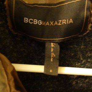Great condition BCBG distressed brown leather vest with dark grey wool sweater contrast in a size small, fits both a S and a XS (on the smaller side) or 0 2. Vest is overall in great condition with some fuzzies on the back sweater portion that can be removed with a defuzzer. I left mine behind in Europe so I don't personally have one on hand at the moment.