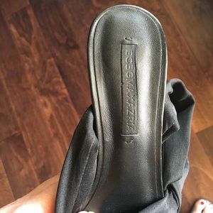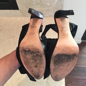 BCBG Max Azria size 7.5 black satin platform sandal that wraps around ankle. 6 inch heel. Some wear on bottom, otherwise great condition. Lots of life left.