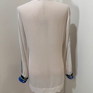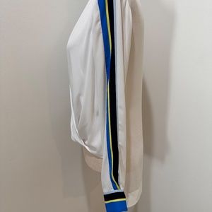 ❤️ BCBG Max Azria white blouse with attached camisole, stripes down the sleeve in blue, navy, and yellow