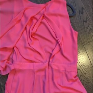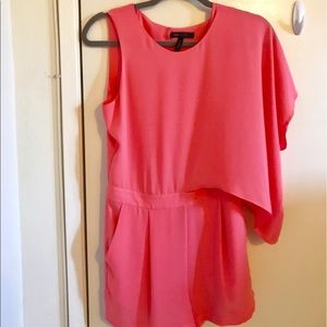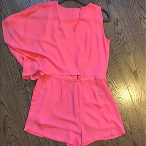 Super cute romper! Only worn once for college graduation. Asymmetrical romper with a cute slit in the back. It's more coral/lighter pink than seen in my photos. Model shots were pulled from Google.