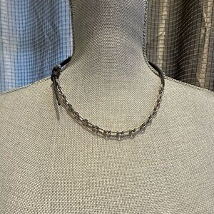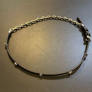 The BCBG Max Azria Black Leather Choker Crystal Clovers Chain is a stylish and trendy necklace that features a black leather choker with silver crystal clovers. The combination of the sleek leather material with the sparkling crystals and silver chain adds a touch of elegance to any outfit. This piece is perfect for those who appreciate fashion jewelry with a modern twist, making it a versatile accessory to add to your collection. Adjustable via mini belt buckle. BCBG tag missing but I bought it there and never wore it! Retail $59