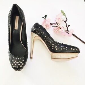 BCBG Max Azria Black Platform Heels NWOB. The BCBG Max Azria Dress Shoes feature a Leather upper with a Open Toe . The Leather outsole lends lasting traction and wear.