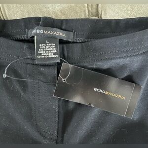 BCBG Max Azria black stretch leggings. Rayon/nylon/spandex blend. Size L see photos for approximate measurements. Silver BCBG logo plaque on the front left side, thick quality fabric. Dark true black, darker than in the photos. Double stitched, faux fly to look like pants, nice enough to wear to work or out on the town. Brand new never worn with tag. Retail $120