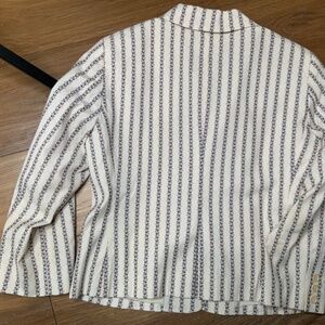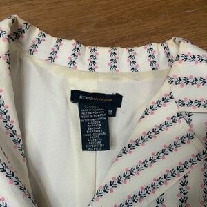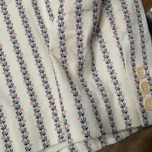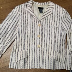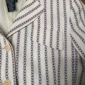BCBG Max Azria blazer. Marked on inside collar. Also, stain on inside of jacket (as depicted by photograph). Pretty cream jacket with black vines and pink accents.