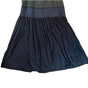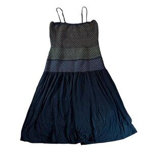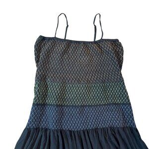 This BCBG midi dress is a chic and versatile piece featuring a smocked bodice with multicolor diamond stitching in neutral, green, and blue tones, paired with a flowing black skirt that drapes beautifully. The spaghetti straps and simple silhouette make it perfect for layering or wearing on its own, giving it an effortlessly elegant yet casual feel.