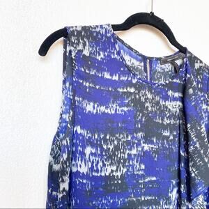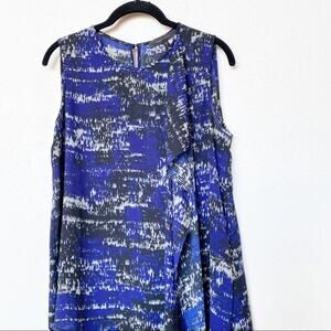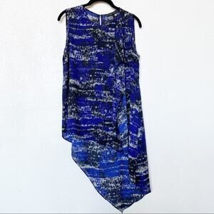 Sleeveless flowy asymmetrical blouse from BCBG Max Azria. Allover blue, black and white pattern. Ruffle edge on the front leads down to long length asymmetrical hem.