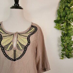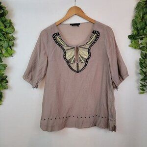 BCBG Max Azria Embroidered Silk Blend Boho Sheer Tan Neutral Blouse Small