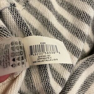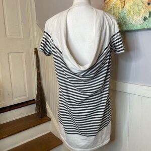 BCBG Max Azria striped sweater dress in a soft, lightweight cotton-blend. Features gray and white horizontal stripes, raw edge short sleeves, and a stunning open draped back with a keyhole cutout. Relaxed fit with a soft, sweater-like feel. Effortlessly chic for summer, travel, or beach layering.