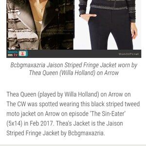 BCBG Max Azria Jaison Fringe Moto Jacket ASO Willa Holland Size S. Pit to pit 17", shoulder to hem 20", Black Gray, Faux Layer Trim, Full Zip 3 Zip Pockets, Zip Sleeve Detail, Shoulder Pads, Retail $385. Good Pre-Owned Condition
