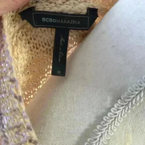 BCBG Max Azria Muiccia Foil Light Brown Gold Cable Knit V-Neck Sweater Dress Medium. In like new condition action. No signs it has been worn. Perfect for Holiday season.