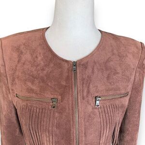 BCBG Max Azria Reiss Vegan Suede Leather Jacket Fringe Accents Hourglass Tan