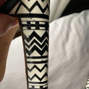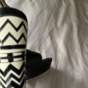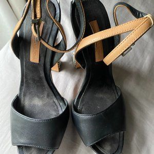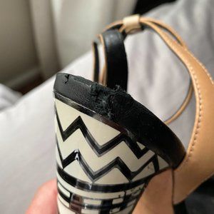 BCBG Max Ariza Tribal Black and Tan Leather Sandals. Beautiful Enamel/Metal Wrapped Heel, 1" Platform w/ 5.1/4" Heel, Adjustable Ankle Strap, Padded Foot Bed.