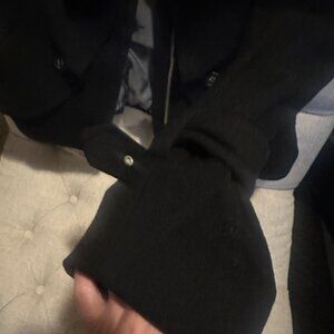 Chic and timeless BCBG Max Azria wool cashmere blend coat in black, size XS. Features structured tailoring, belted sleeve detail, button and zipper front closure, and fully lined interior. Material blend includes wool, rayon, and cashmere for warmth and softness. Excellent condition — sleeve belt shows very slight wear that can be touched up (see photo). Perfect for professional, dressy, or everyday cold-weather wear.