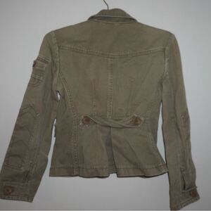 Stylish military-inspired jacket. Features multiple pockets. Button-up front. Perfect for layering.