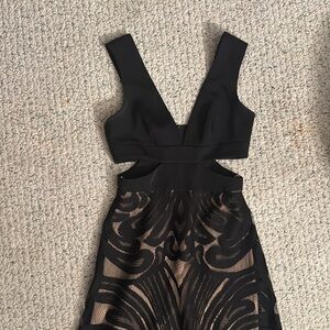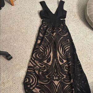 This exquisite gown by BCBGMaxAzria showcases a striking black and tan color palette, perfect for prom or cocktail events. The sleeveless design and V-neckline add a touch of elegance, while the cutouts enhance its allure. The gown's fitted silhouette and intricate detailing make it a standout choice for any formal occasion.