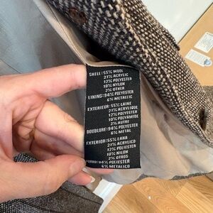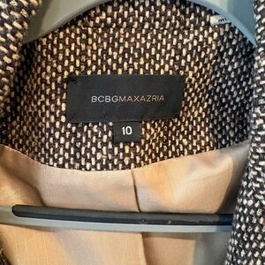 BCBG Wool Coat features a button down front, two large front pockets, heavy fabric, button down cuffs, and black and tan color with gold streaks throughout. Wear this for everyday warmth or dress it up for a special event. Gently used, but minimal signs of wear- it does have one broken button on right cuff (pictured)