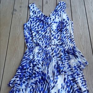 Sleeveless BCBG MaxAzaria ruffled blue and white patterned dress. Side zip and elastic waist. Measures 34" from top to bottom.