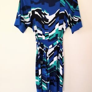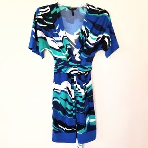 Colorful, feminine perfect to wear to work and for a night out. This dress wraps and crosses the front and ties in the back as to accentuate the waist. Gently used and in great condition.