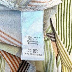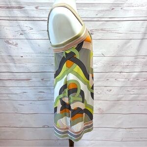 BcbgMaxazria Mod abstract Emilio Pucci mod type dress. Silky jersey knit dress. Bought at Bloomingdales. Retro color scheme with bright orange, Chartruese and brown. Reverse V-halter front with adjustable straps. Marked a size Small but seems to run small in the chest. In great condition.