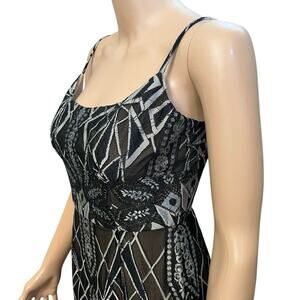 Beautiful lace sheathed dress. Midi length. Lined except for the bottommost part of the hem. Adjustable spaghetti straps.