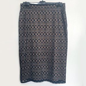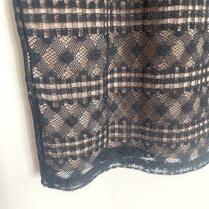 BCBG MaxAzria Black Lace Skirt & Crop Top Set. Black geometric lace with beige mesh underlay. Stretchy, comfortable, and super flattering. Worn once, in excellent condition with no noticeable flaws. Smoke- and pet-free home.