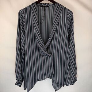 BCBG MaxAzria Blouse Sz S Midnight Teal Asymmetrical Wrap White Pink Stripes