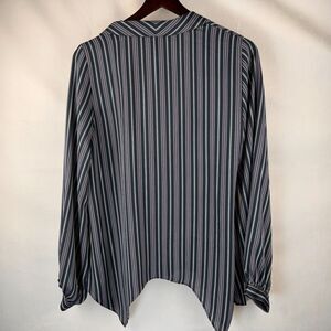 This BCBG MaxAzria blouse in size S features a midnight teal color with white and pink stripes. The blouse has a surplice V-neckline and inside tie closure, with a relaxed fit and long balloon sleeves. The blouse is made of polyester and is machine washable. Perfect for all seasons, this blouse is ideal for versatile occasions and can be worn in winter, summer, fall, or spring. The garment care is easy, and it is not handmade. The blouse is not vintage and was manufactured in Vietnam. The brand is BCBGMAXAZRIA, and the blouse is a regular fit. Removable waist tie-belt not included.