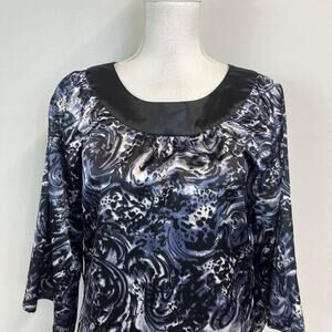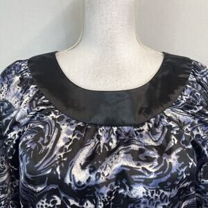 BCBG MaxAzria Blouse Top sz Medium Black Blue Paisley Satin Modest Church Career