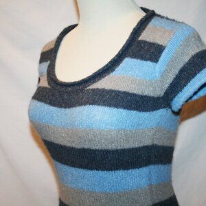 Super cute short sleeve, rounded neck sweater made by BCBG Max Azria. Slim fit stretchy fabric with roll neck and cuff edges. Gray Blue, Light Blue and Gray striped. There is no size tag but sweater is pretty small, see measurements below.