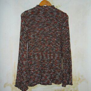 This BCBG MaxAzria cardigan sweater is a versatile piece for any wardrobe. With a relaxed fit and flared sleeves, it features a mock neck and brass button closure with beaded accents. The chunky slouchy boho knit design, made of nylon and acrylic materials, provides a breathable and comfortable wear for the fall, winter, and spring seasons. Perfect for any occasion, whether it's a wedding, party, or casual business outfit, this sweater has a Y2K, contemporary, and bohemian theme, making it a great addition to any outfit. The sweater is available in size L and is suitable for regular size types. Get this stylish cardigan sweater today and elevate your fashion game!. Brown Orange White mixed knit,,,beautiful