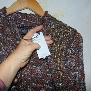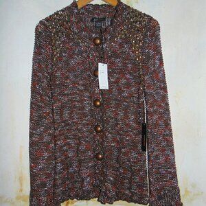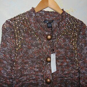 BCBG MaxAzria Cardigan Sweater Brown L Beaded Brass Button Chunky Knit Crochet