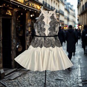 Gorgeous and flattering halter mini dress with black lace overlay and keyhole neckline. Perfect for cocktail parties, weddings, or special events.