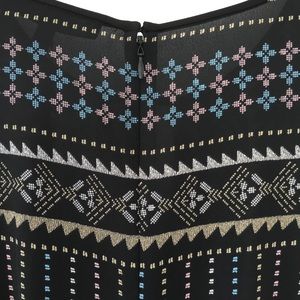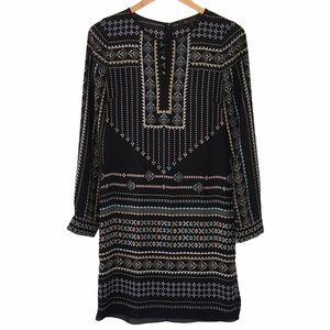 NWT Long sleeve Freya shift column tunic style dress with keyhole neckline, back zipper, fabric covered buttons at cuffs. Black with pink, blue, tan, and cream boho geometric print. 100% polyester, machine wash.