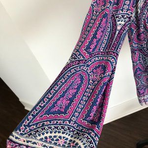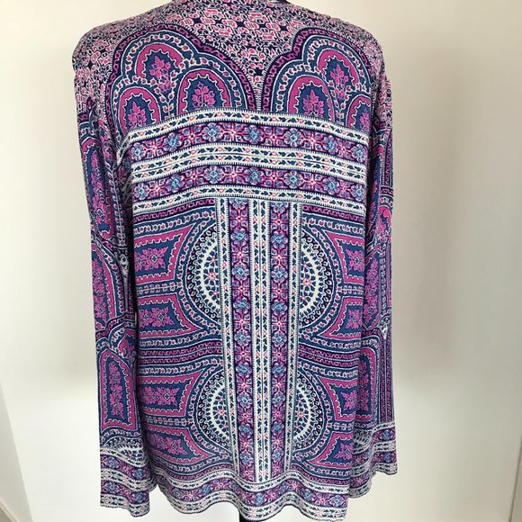 Beautiful, resort wear summer top. V-neck, blouse is flowy with a design in gorgeous pink, blue and white. Long sleeves have swiss tabs (button and tab) to make rolling up easy. Fabric is viscose/crepe. Blouse is in excellent condition - never worn. Size L.