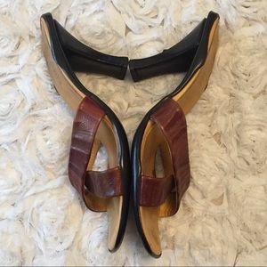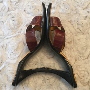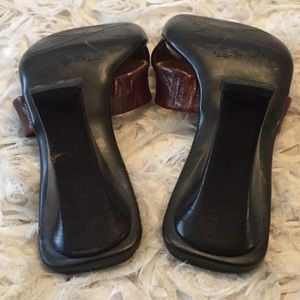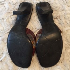 Cross strap brown multi heels, rubber soles, leather upper, 3" heel, does have a scuff on right heel (see last picture), used in good condition, does not come with shoe box or dust bag, price as is