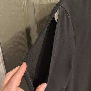 V neck, split long sleeves with button at wrist closure, button back, rhinestone collar detail, crepe material, hits at mid thigh, pockets!
