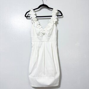 Beautiful BCBG MaxAzria mini dress in white. Features a v-neck with a ruffle detailing and adjustable straps for the perfect fit. Perfect for any special occasion! Excellent pre-loved condition - no flaws!