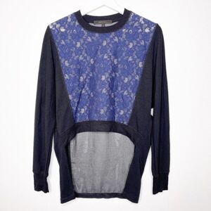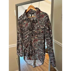 Stunning long sleeve blouse, keyhole opening in front, by BCBG MaxAzria. Size Small. color: blues and a rust red with cream/white. NWT. Retails for $158.