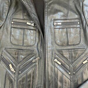 Received as a gift and worn 1 time, super comfy leather jacket with stretchy sweater back and half sweater/half leather on the arms.