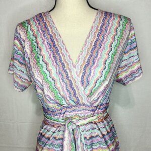 BCBG MaxAzria Multicolor Belted Tie-Back Dress V-Neck Surplice Stretch Sz S, 94% polyester, 6% spandex
