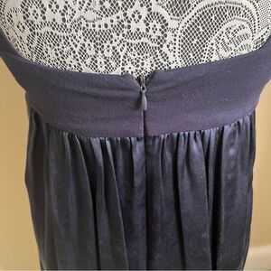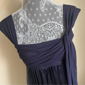 BCBG MaxAzria navy blue Dress with Bubble shirt. Top is cotton with knotted neck line and 2 shoulder straps. Silk line bottom bubble hem just above the knee. EUC