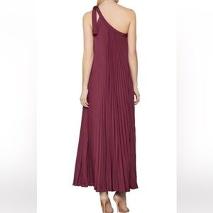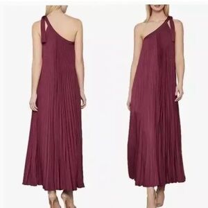 BCBGMAXAZRIA Pleated Tie-Shoulder Maxi Dress Red Burgundy Merlot Size XXS Sunburst pleating defines this BCBGMAXAZRIA tent dress, featuring a bow tie closure at the single shoulder. Allover pleated Asymmetrical neckline Style #JUF6Q674 Imported Pullover style; tie closure Materials & Care Satin: polyester; plain weave lining: polyester/spandex Machine washable NWT