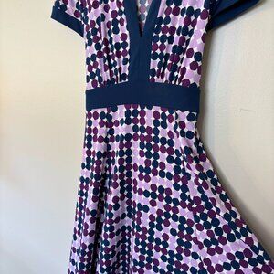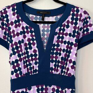 BCBG MaxAzria dress, polka dot dress, midi dress, multicolor dress, spring dress, designer dress, V-neck dress, retro style, BCBG size medium, purple pink navy dress, stretchy dress
